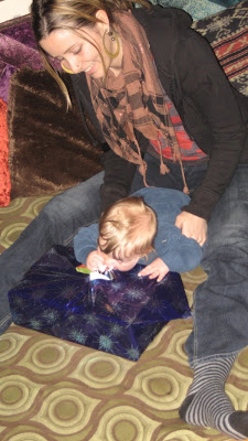 For x-mas we had a big potluck with friends, a few days later Grammy bee delivered a shiney present which Mala tried to rip open with his teeth!yum yum